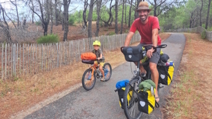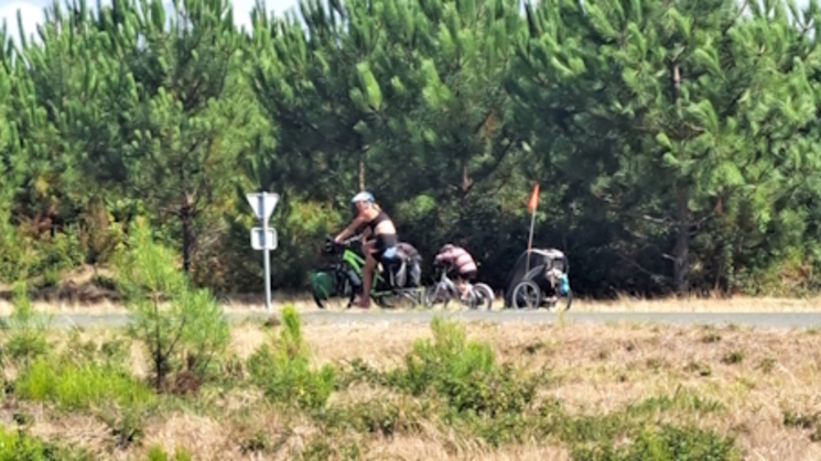 Ik kom veel fietsende gezinnetjes tegen die kamperen. Zie de foto's, een trotse en blije papa met zoontje èn n mama met -slapend- kindje op de aanhangerfiets. Stoer van ze èn ik word er telkens blij van.