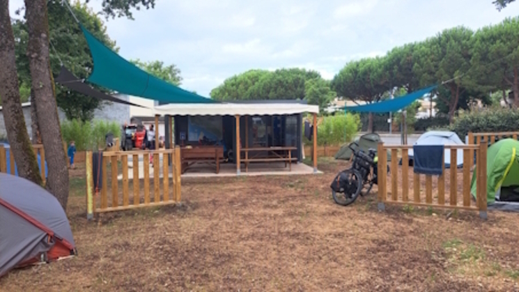 De op één na laatste foto laat een plek op een camping zien voor 5 fiets-tentjes. Gebouwtje met koelkast kluisjes waterkoker èn overdekte picknick tafels, whaaw.