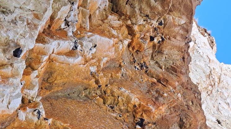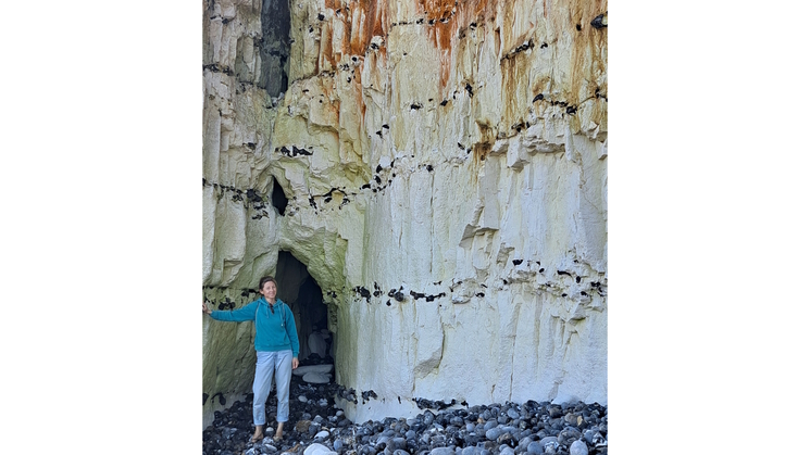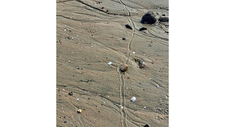 Fascinerende strand details met ploeterend schelpdiertje/ 120 m hoge heuvel/ vissersboot in le Trepor/ huisjes aan de overkant.